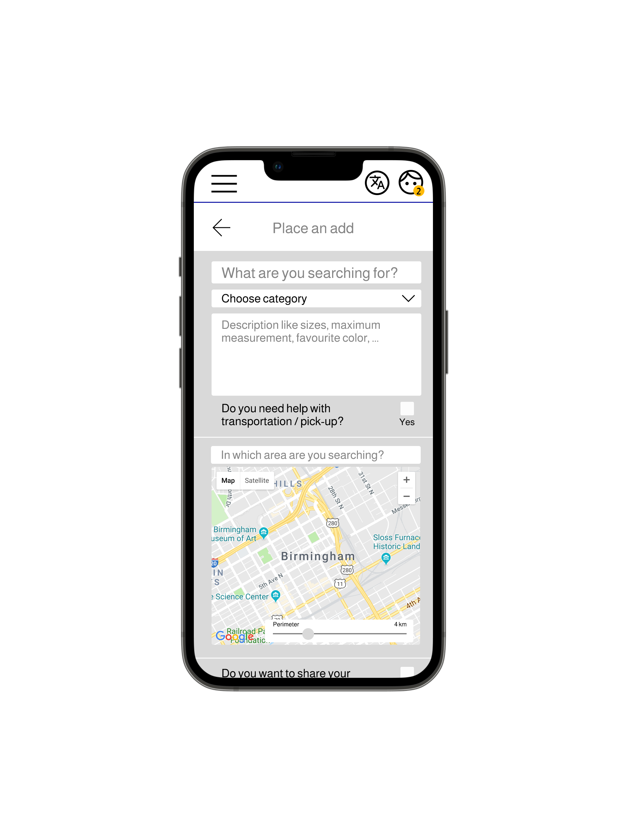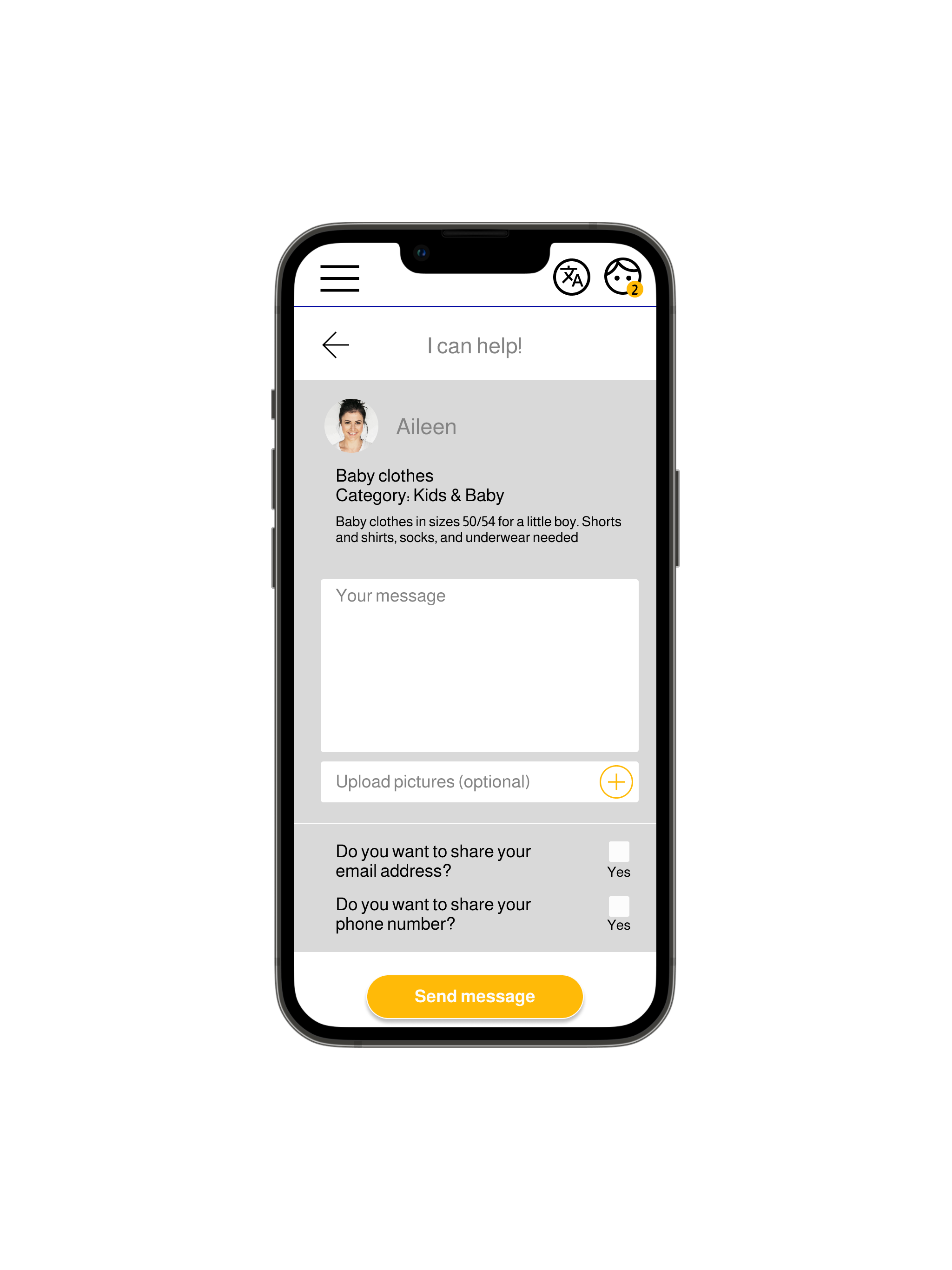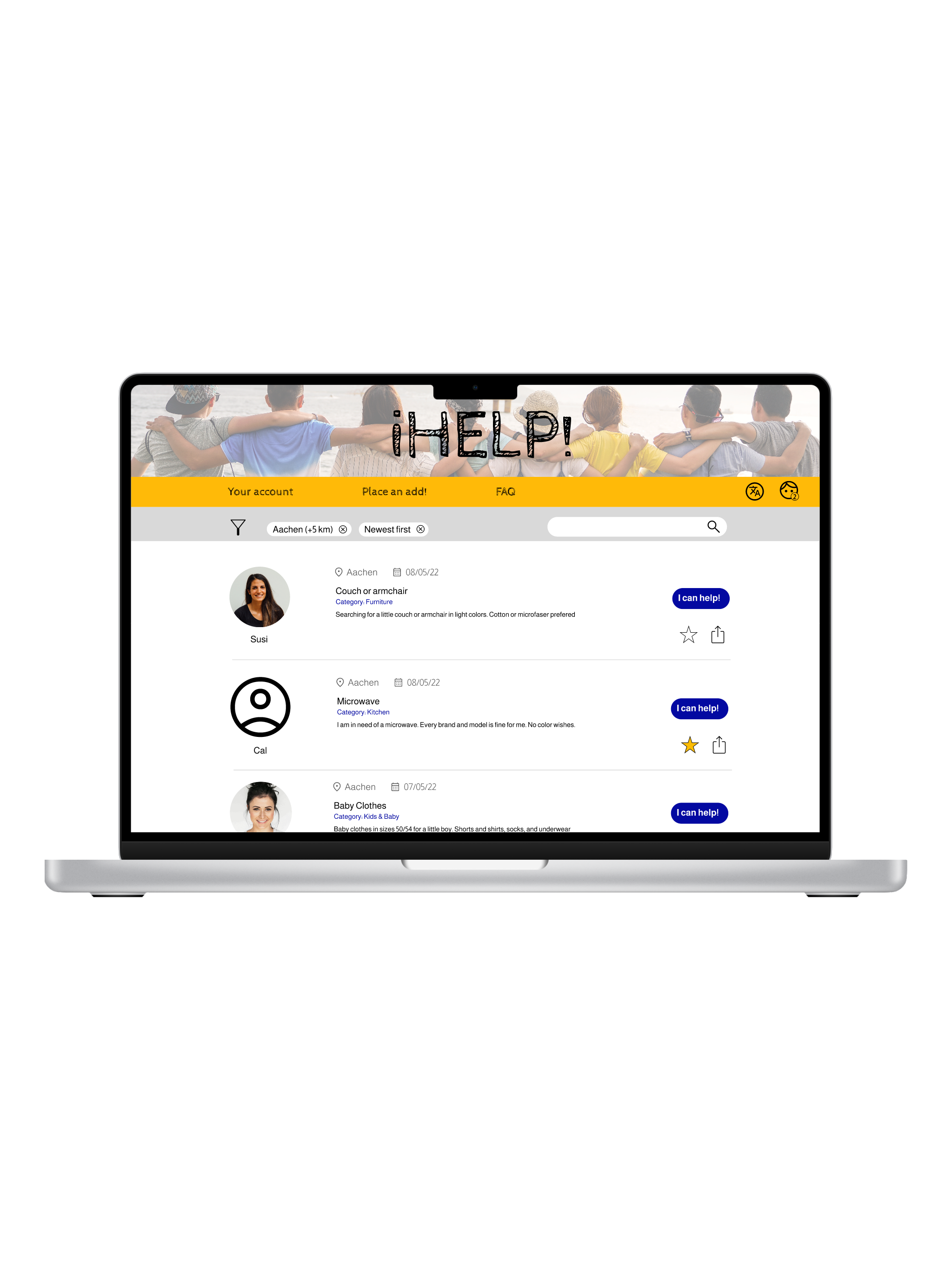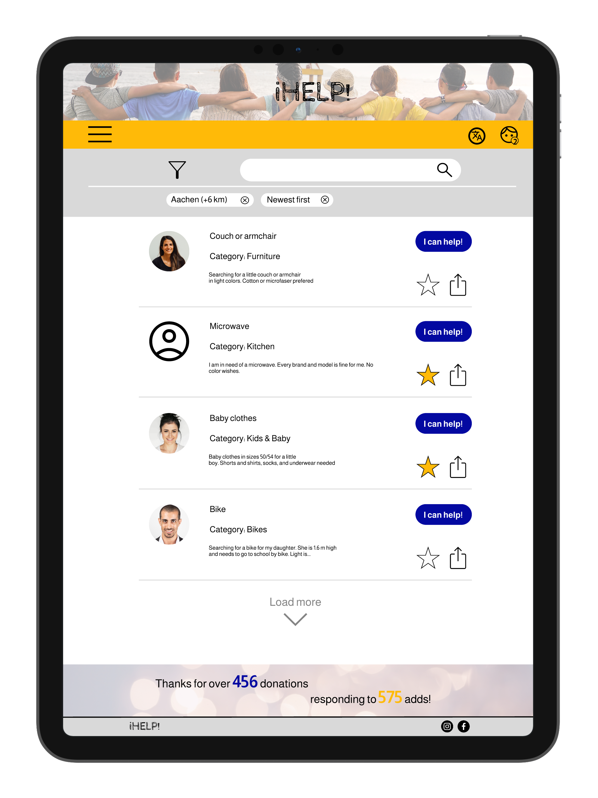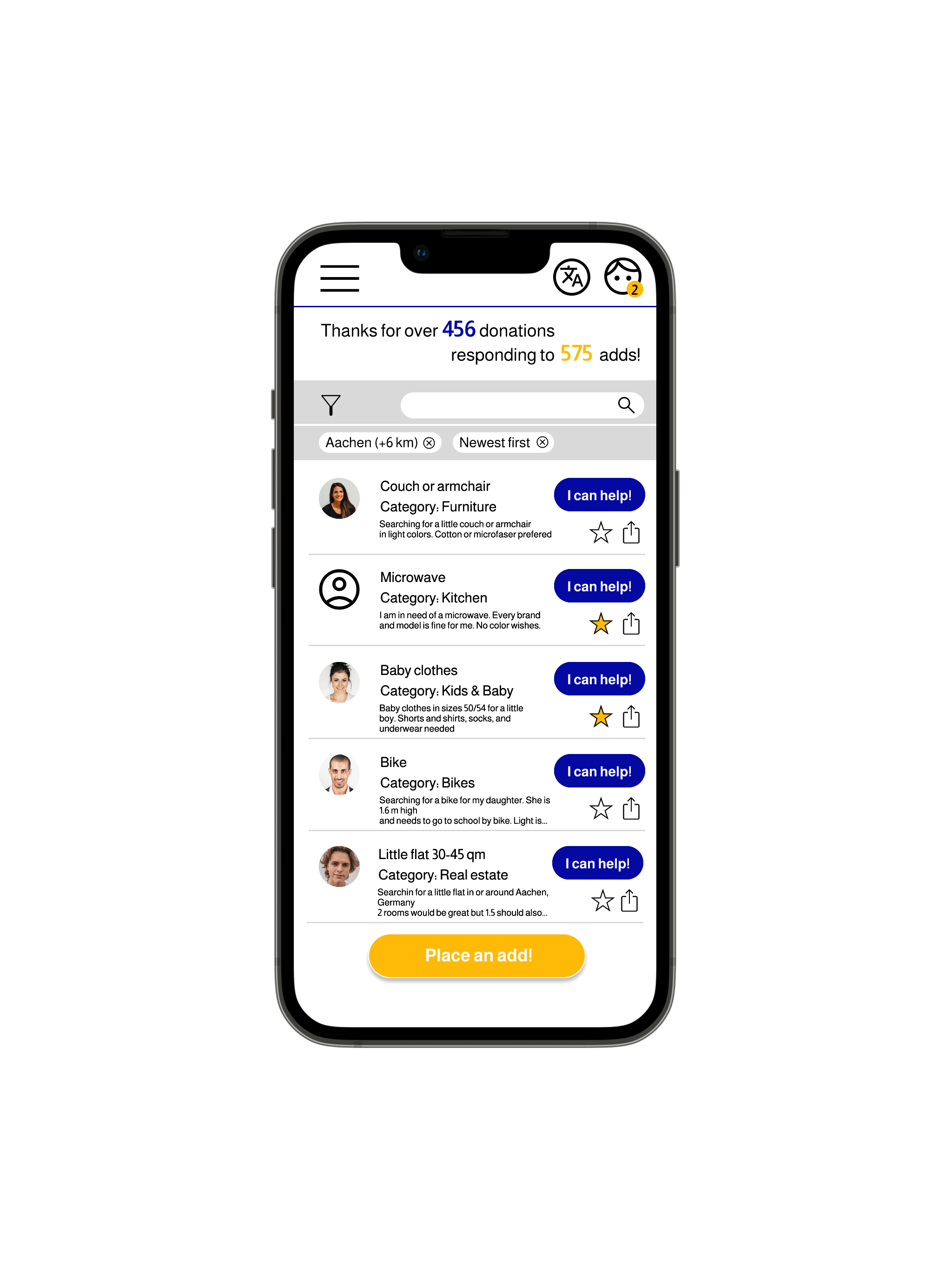 The product is a platform that allows individuals (refugees) to create ads for things they need. People that want to donate can browse these ads and respond to them.