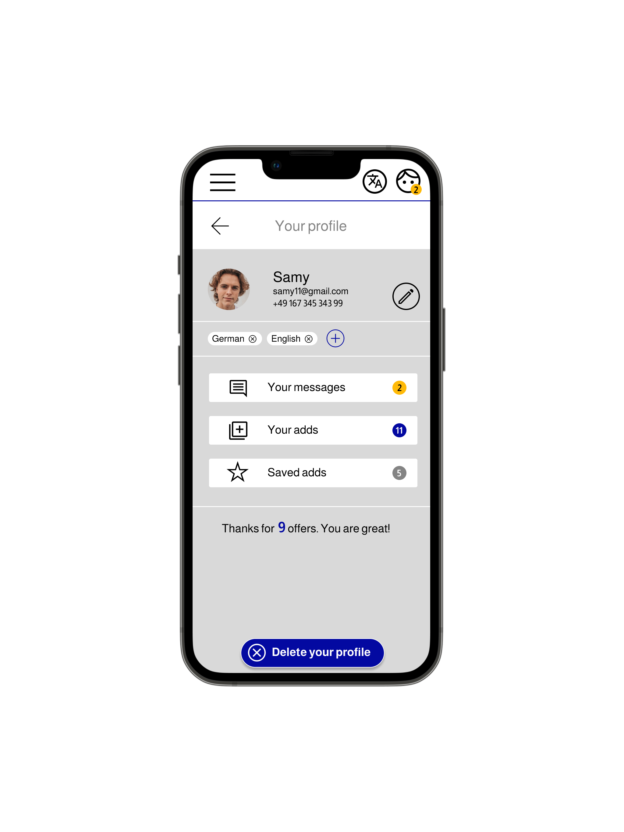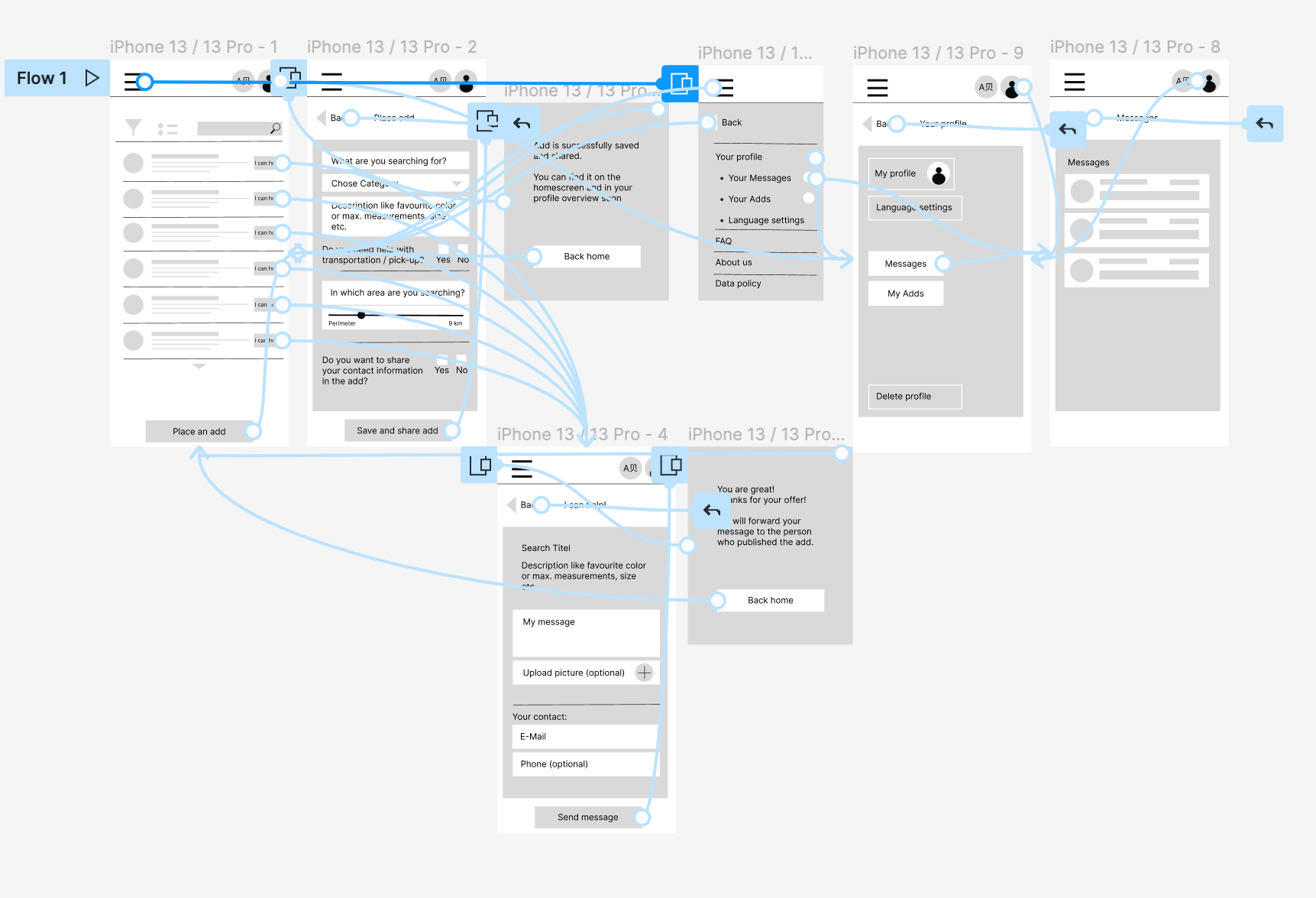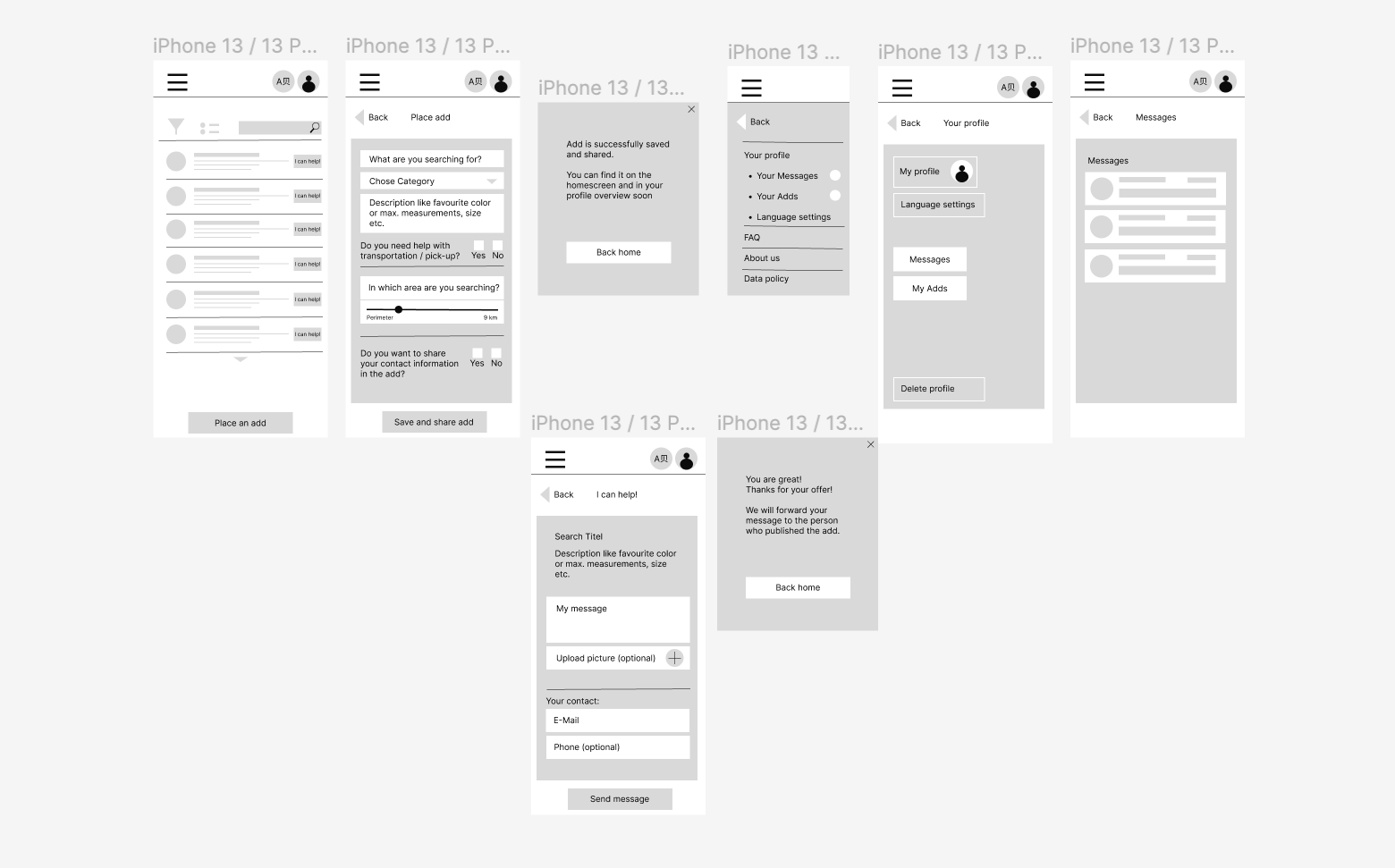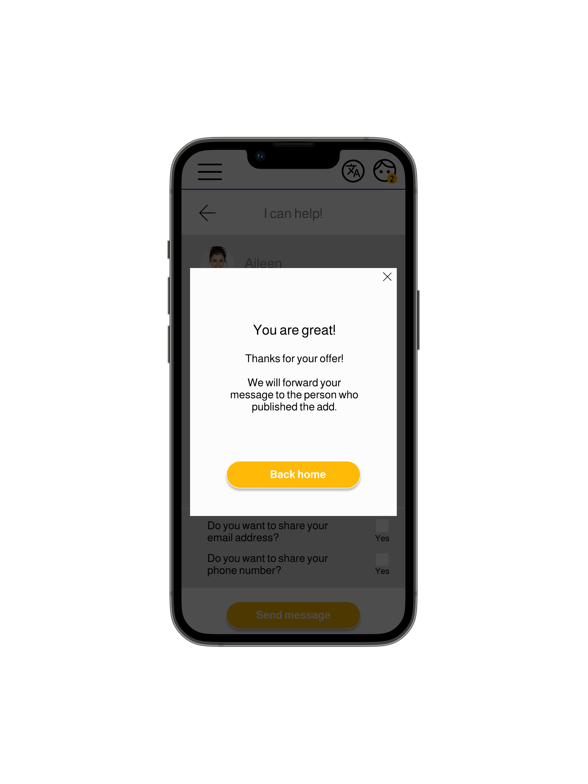 I had the goal to make the app as simple as possible and as accessible as possible, so I started by creating wireframes to test its usability. A critical consideration during the design process was that both parties would not necessarily speak the same language, which had a profound impact on the UX design.